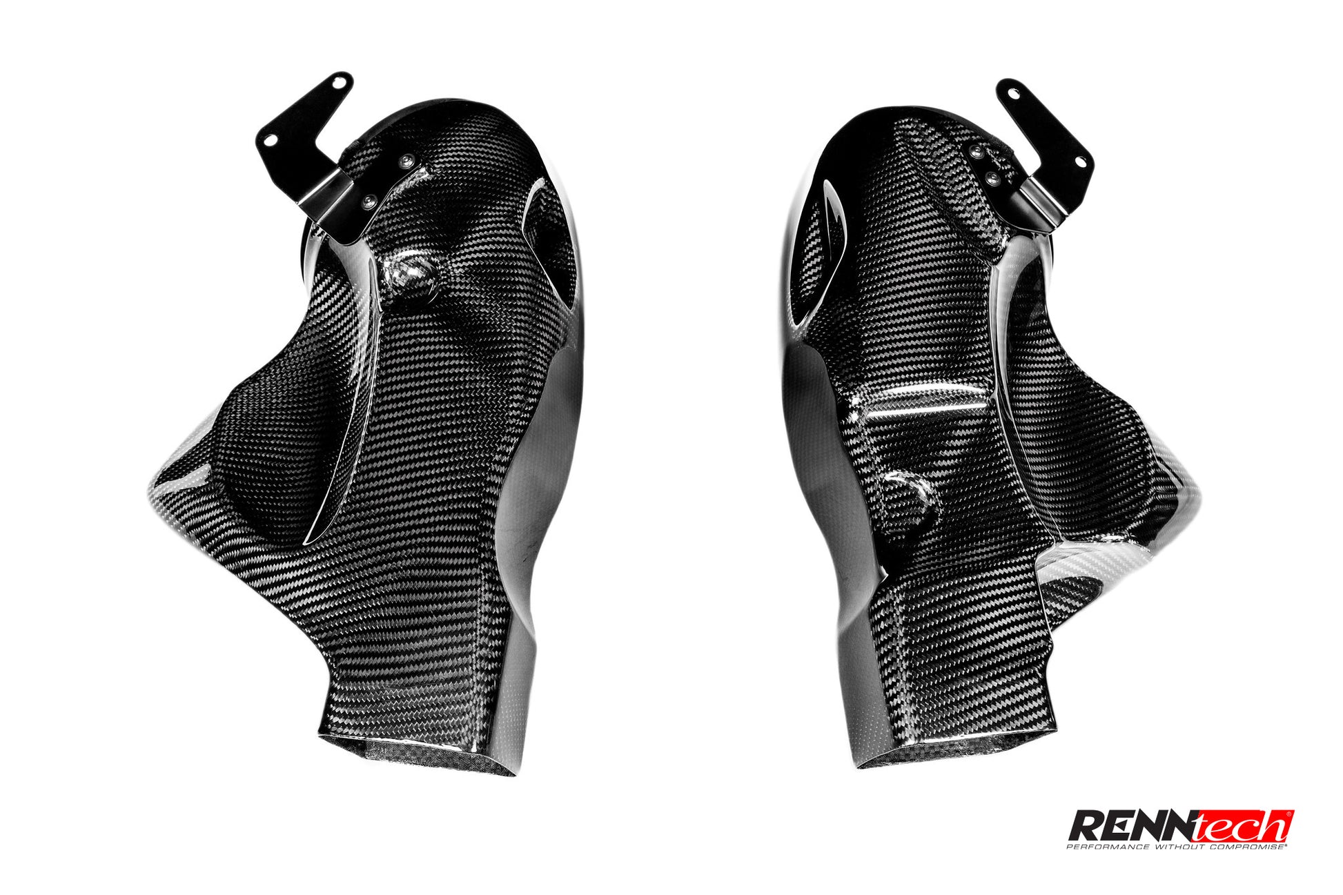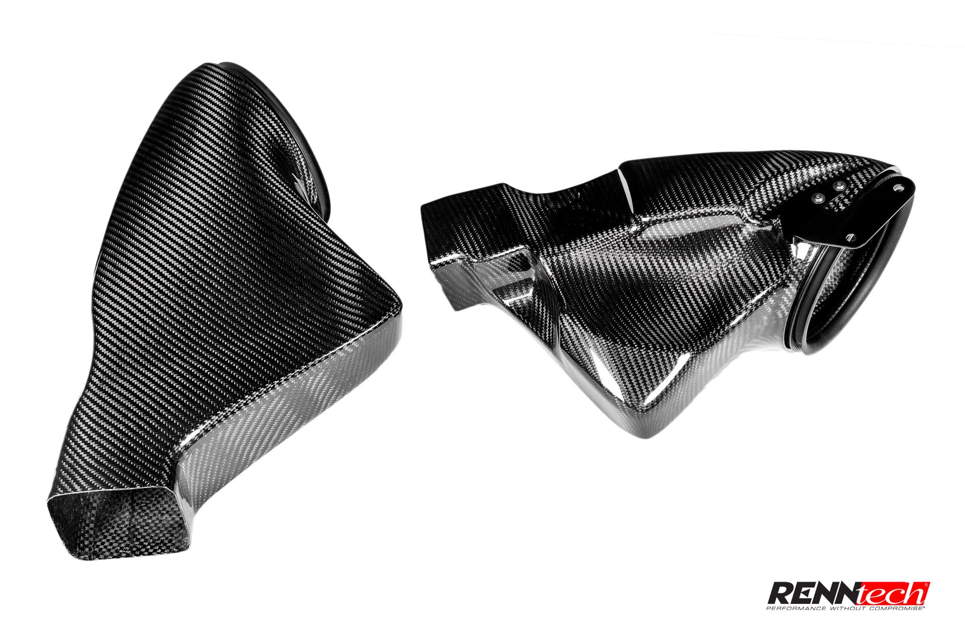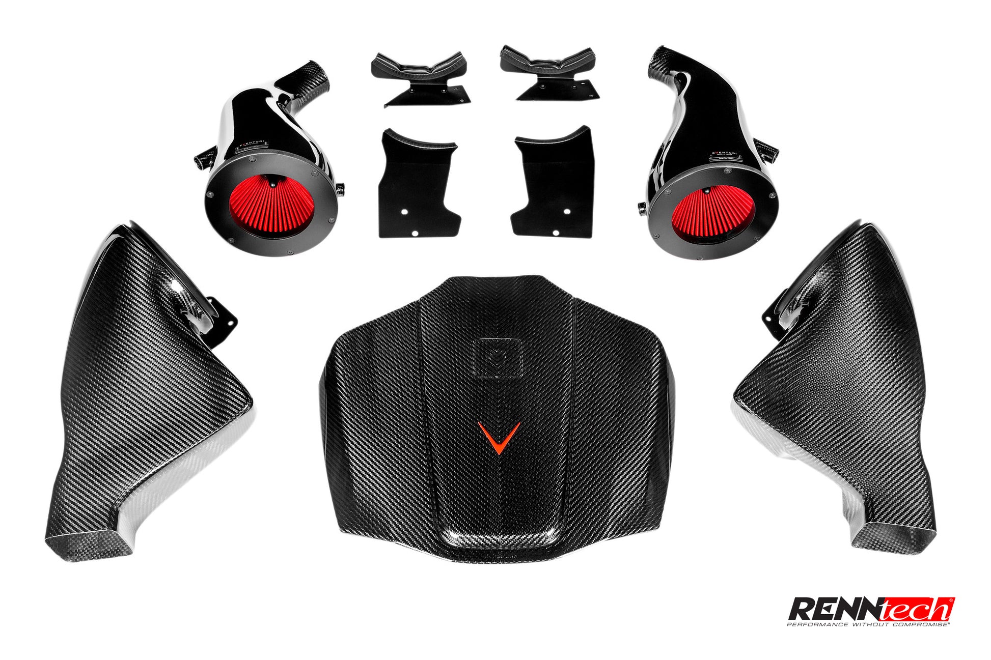 Co developed with RENNtech, the AMG GT Eventuri intake is a fully sealed system which was developed through extensive real world testing and airflow simulation analysis. It features our patented Venturi housings which allow for the smoothest possible airflow to the turbo inlets. The housings encase our bespoke filters which help to shape the airflow and maintain laminar conditions. They have also been maximised in internal volume to reduce restrictions and in doing so we have also redesigned the OEM central cover as it fouls on the significantly larger system. Finally, intake air temperatures are kept steady with the ducts which seal to the filter housings. The AMG GTR intake system has been independently tested by World leading Mercedes tuning company – RENNtech and has been proven to give improved performance in both stock and tuned engines. Each system comes complete with the carbon central cover.