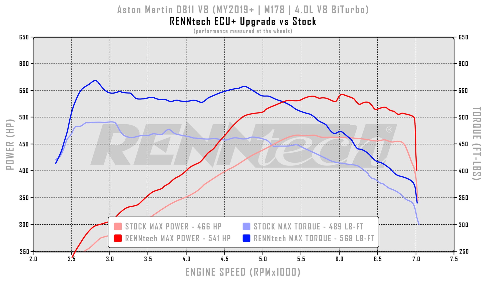 • Numbers published by Aston Martin are an average over a 750rpm range for HP and a 2,000rpm range for TQ. Power gains are calculated based on the peak stock performance measured by RENNtech.