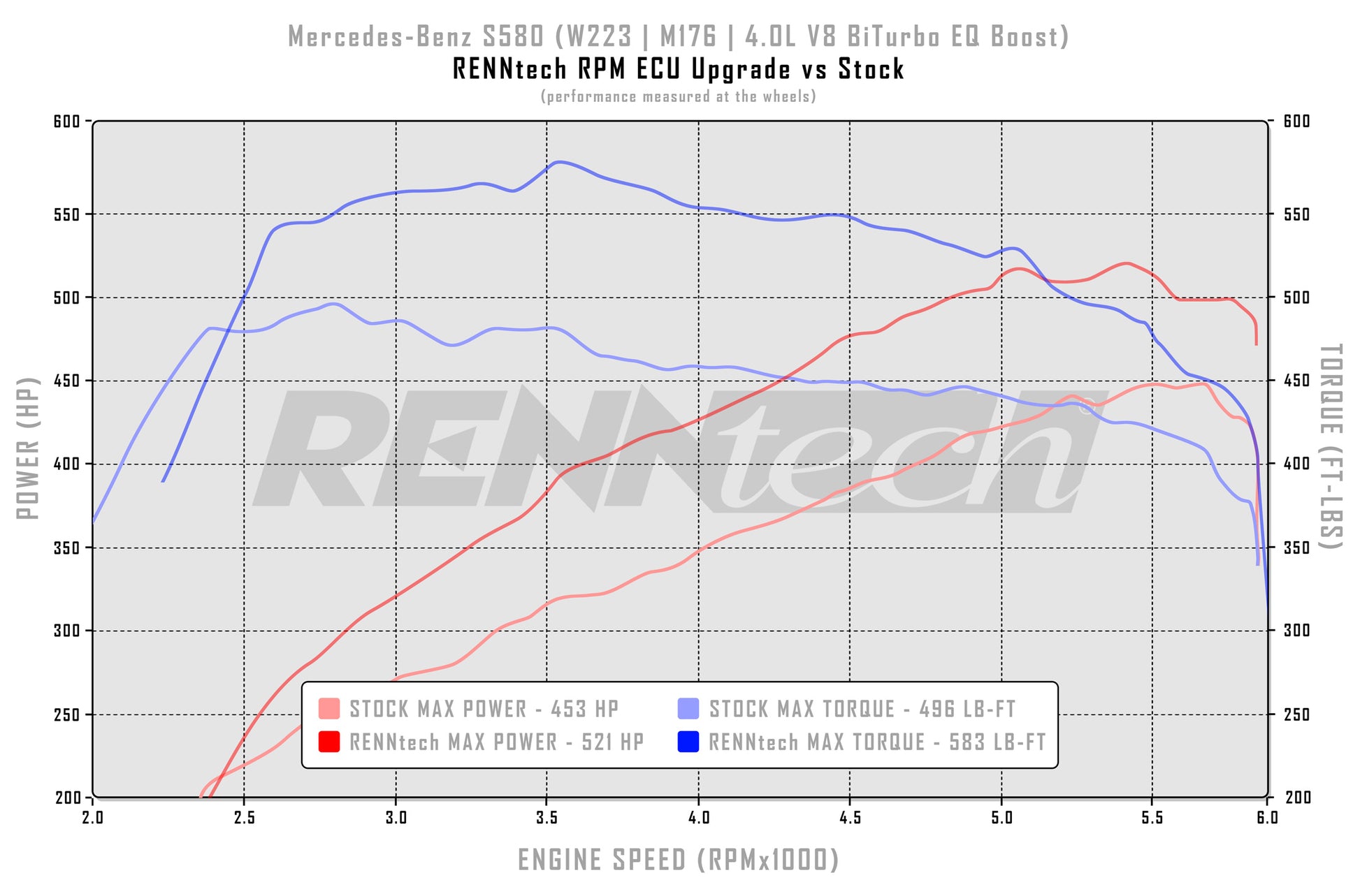 The RENNtech Power Module (RPM) ECU tune delivers significant horsepower and torque gains across the entire power band. By modifying boost mapping and keeping optimized air-to-fuel ratios, the entire power and torque curve is shifted upward delivering +80 HP +101 LB-FT in the Mercedes-Benz M176 4.0 V8 BiTurbo EQ Boost -engine, based on Dyno measured power figures.