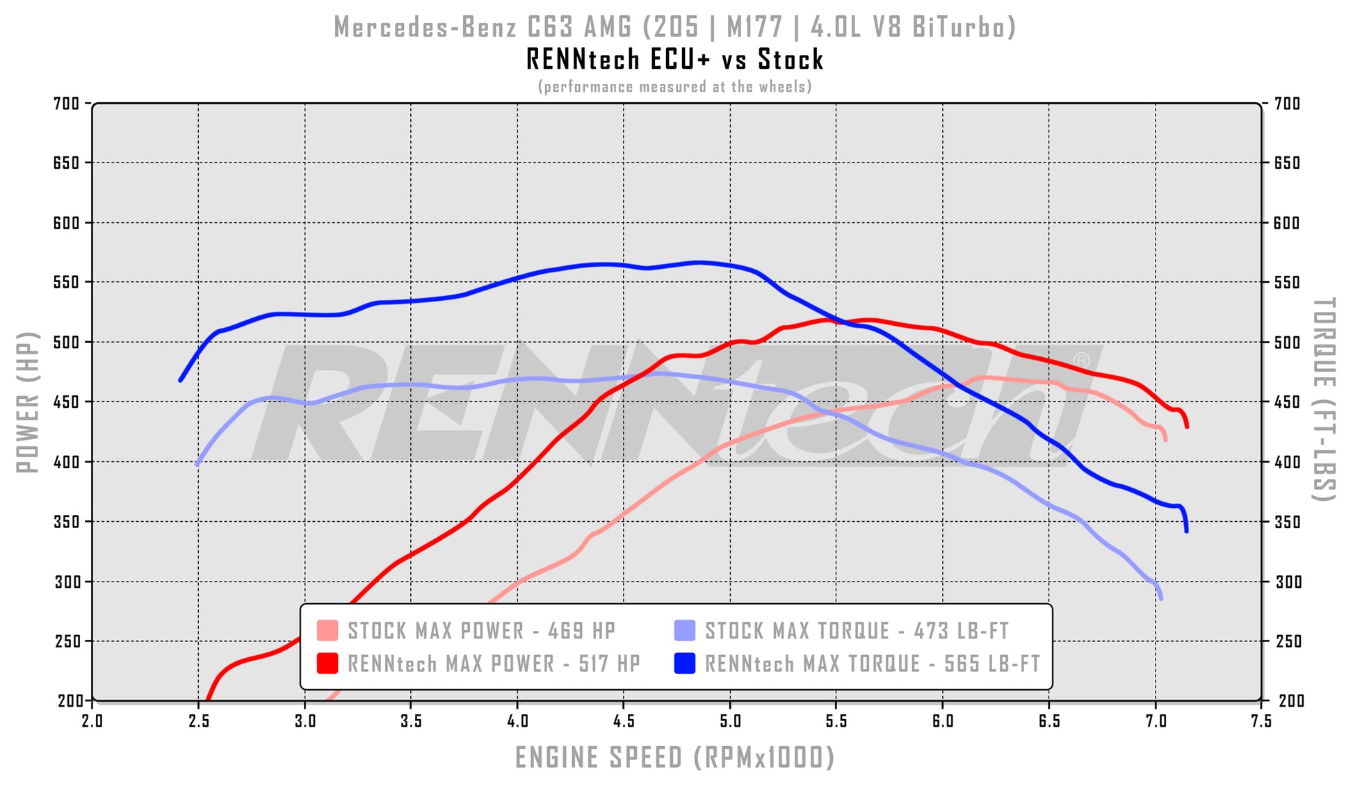 • Note: Mercedes M177 engine performance when measured on the dyno obtains higher power numbers than rated from factory. Performance numbers published by MBUSA are a calculated average within a specific rpm range, which obviously result  in lower power numbers than at the peak. HP and TQ gains calculated by RENNtech are always based on peak stock results measured by RENNtech and upgraded peak results measured by RENNtech.