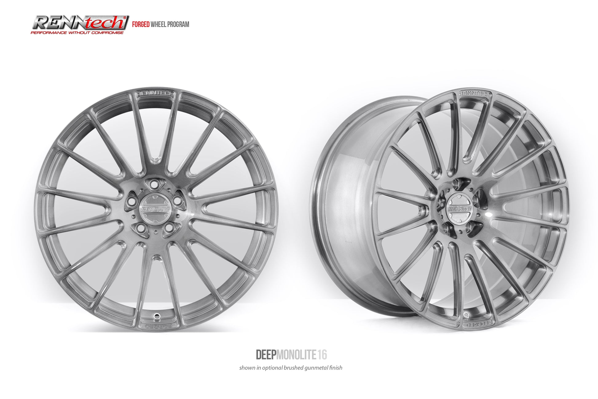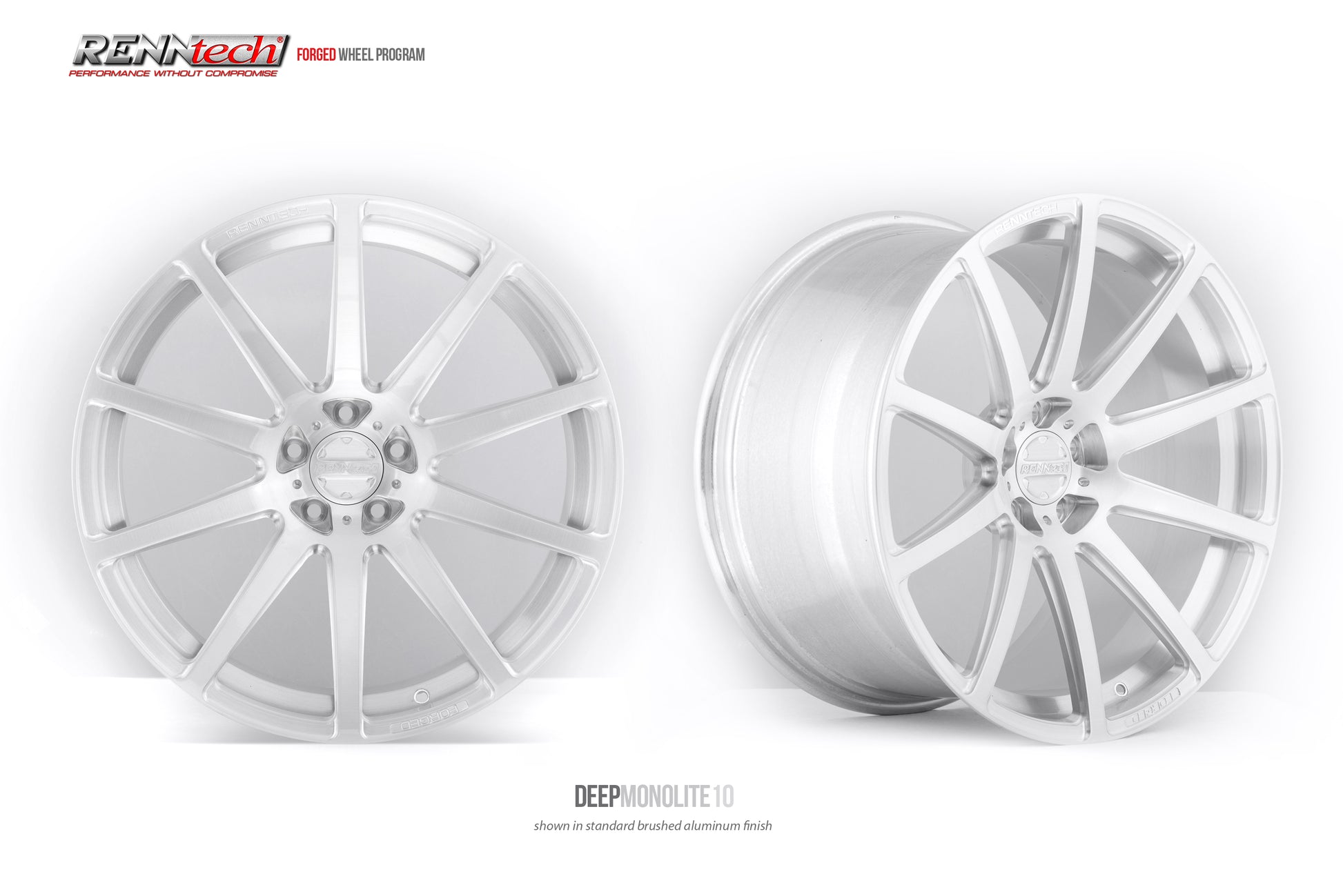 - CNC machined RENNtech center cap design “RENNtech” logo and “Forged” machined in adjacent spoke windows