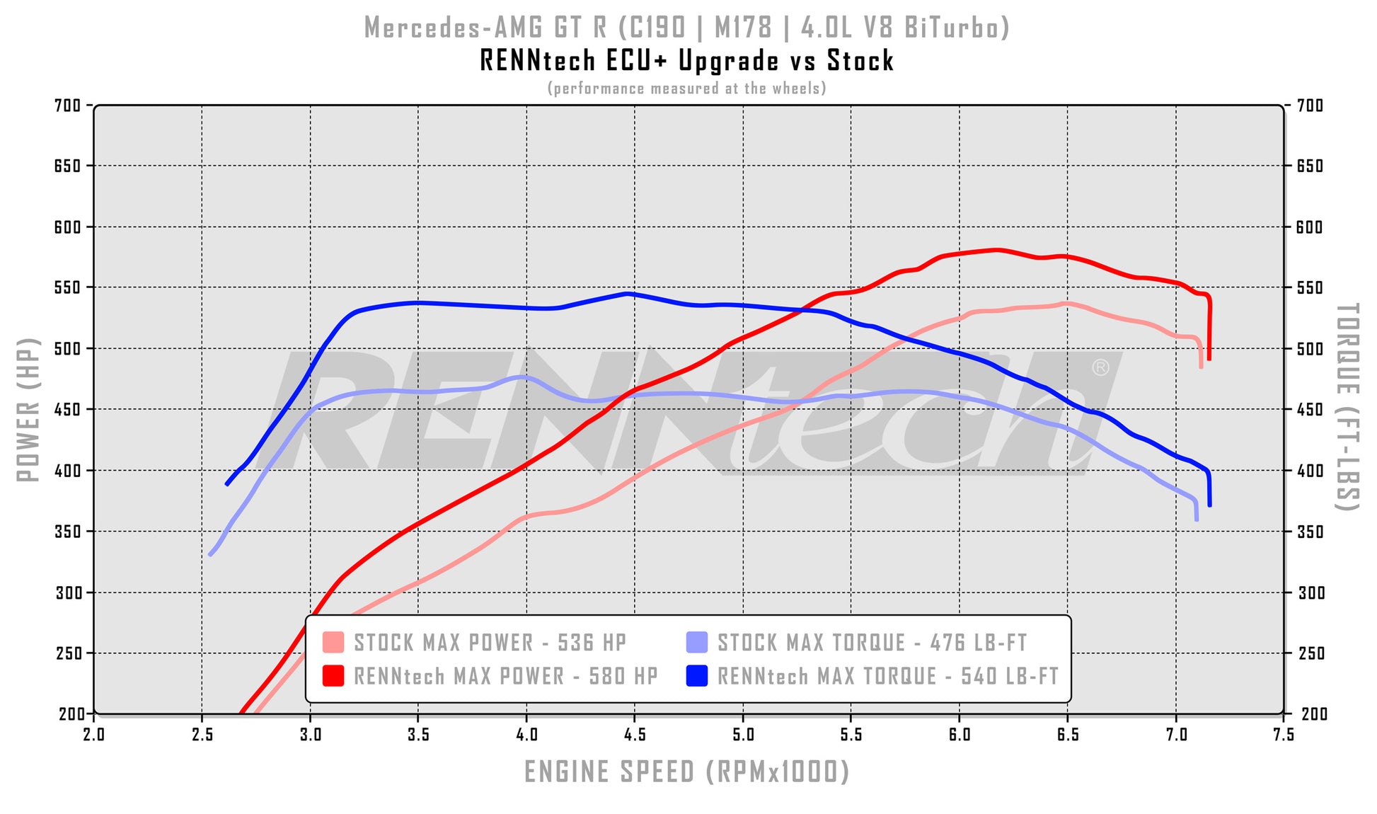 - Les gains de puissance sont calculés à partir des valeurs de série mesurées par RENNtech. Les performances du vilebrequin sont calculées avec une perte de transmission de 12 % sur l'AMG GT.