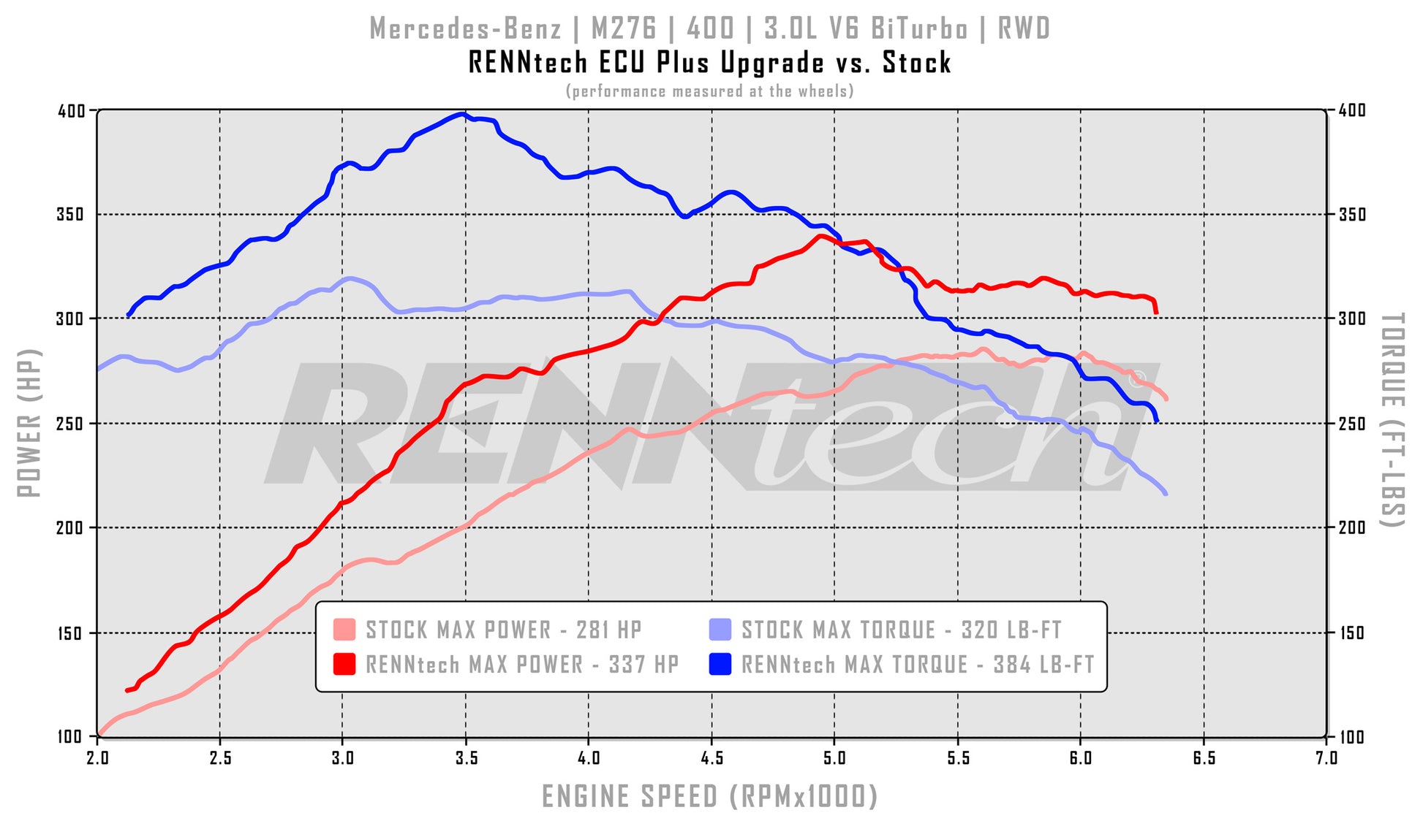 Grâce au réglage exclusif du calculateur RENNtech , la W213 - E400 gagne jusqu'à 53 ch et 78 Nm de couple , selon les mesures de puissance réalisées par RENNtech. Veuillez noter que les performances du moteur Mercedes M276, mesurées, sont supérieures aux valeurs nominales d'usine. La puissance maximale atteinte avec la mise à niveau du calculateur RENNtech pour la E400 est de 392 ch et 463 Nm de couple .
